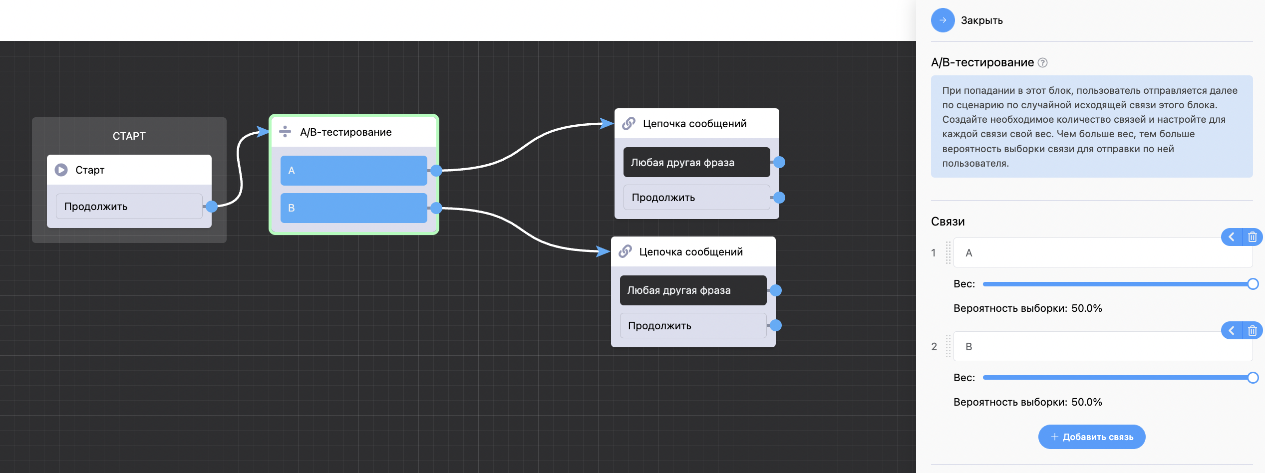 При попадании в этот блок пользователь отправляется далее по сценарию по случайной исходящей связи этого блока. Создай необходимое количество связей и настрой для каждой связи свой вес. Чем больше вес, тем больше вероятность выборки связи для отправки по ней пользователя.